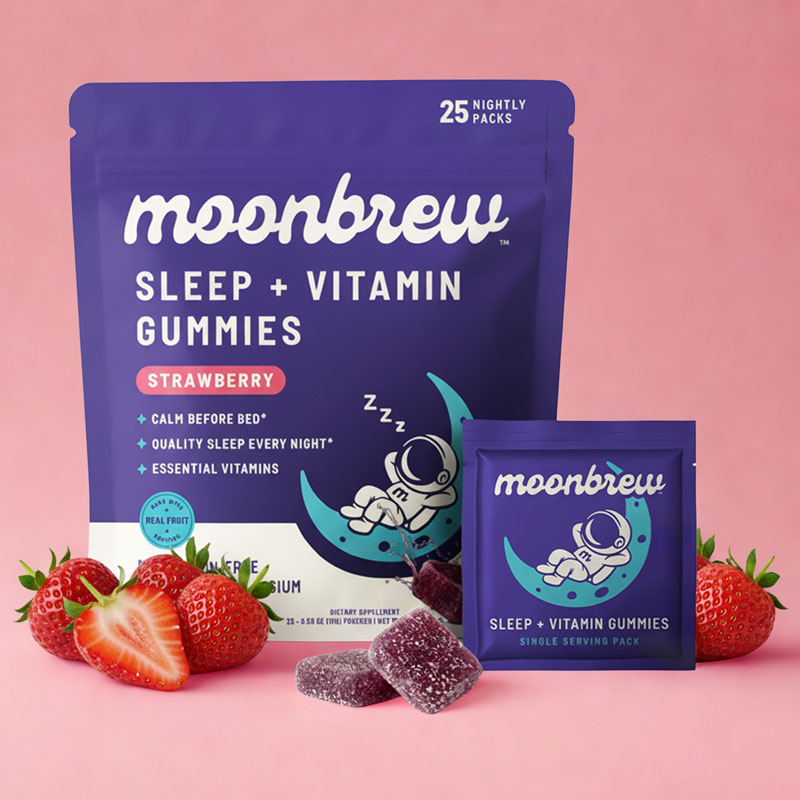 Previously known for their magnesium-based hot cocoa sleep aid, MoonBrew has grown rapidly, helping over 800,000 people sleep better using their superfood nighttime drinks. Now, the brand is entering the gummies space with new Sleep + Vitamin Gummies — strawberry-flavored nightly snack packs that combine MoonBrew’s strongest sleep ingredients with half your daily vitamins in a nostalgic, portable format.